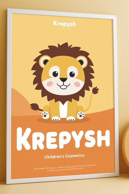 Make an advertising minimalistic and concise poster for brand of children’s cosmetics named Krepysh with a cartoon lion cub n yellow-orange shades in the street