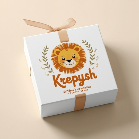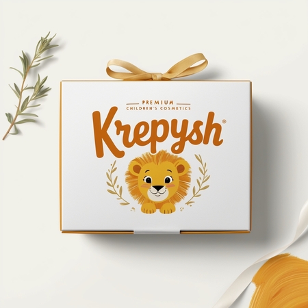 Make a minimalistic a giftbox for brand of children’s cosmetics named Krepysh with a cartoon lion cub in yellow-orange shades