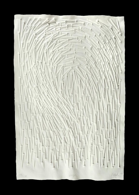 Он хаотично разбрасывал гвозди на лист бумаги, накрывал вторым и прокатывал через печатный станок. Получались уникальные случайные офорты. Подобно сюрреалистам, он придавал композициям новые смыслы, называя их то дождем, то туманом, то криком
