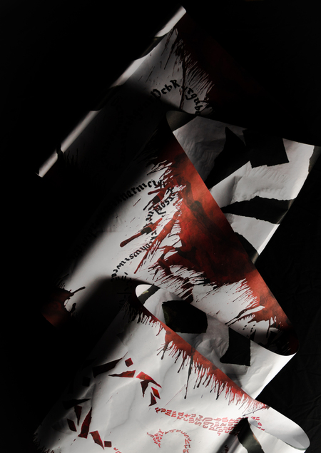 В своей работе я использовала готический шрифт, который можно было встретить в процессе прохождения игры в письмах или на вывесках магазинов. Дело в том, что фоновым периодом разворачивающихся событий стало средневековье, для которого как раз и актуально использование готики. Также из игры был взят драконий язык, которым были написаны ту’умы. При его создании я использовала автопен. Шприцом же я постаралась добавить еще больше динамики сюжету, сымитировав брызги крови.