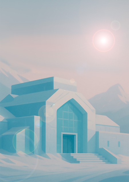 Midjourney: «/imagine: icy hotel, fjord, cinematic lighting, minimalism, 16:9»