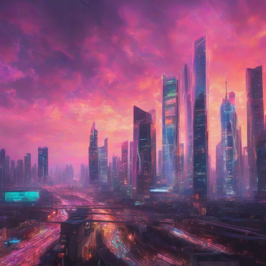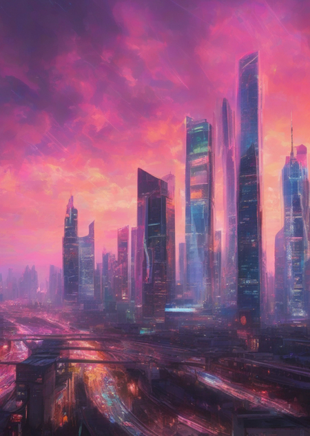 Серия включает разнообразные сюжеты: от природных до городских пейзажей, которые гармонично сочетаются друг с другом. В изображениях можно увидеть преобладающую цветовую гамму Cyberpunk и художественный приём мазков художника. Это полностью соответствует изначальной задумке проекта.