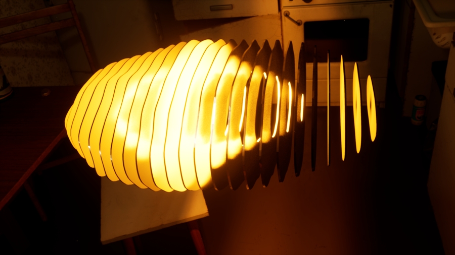 Объект представляет собой конструкцию из 24 равноудаленных элементов-срезов неправильной геометрической формы, удерживаемых при помощи индивидуальных креплений (нитей). Элементы подвижны, но не взаимозаменяемы. Во внутренней полости-жеоде срезов расположена лампа НЛВД или ее имитация, аналогичная лампа с низкой цветовой температурой и низкой передачей цвета.