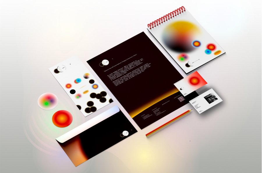 Create a stationary shop with marks, stationary, tote and other merch for the Olafur Eliasson Prismatic Planetarium using gradients, and spherical shapes. The colors are subtle: light orange, light green, and dark gradient black holes.