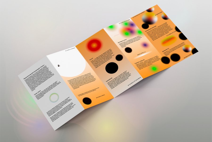 Create a planetary infographic booklet in a classic rectangular format for the Olafur Eliasson Prismatic Planetarium using text, gradients, and spherical shapes. The colors are subtle: light orange, light green, and dark gradient black holes.