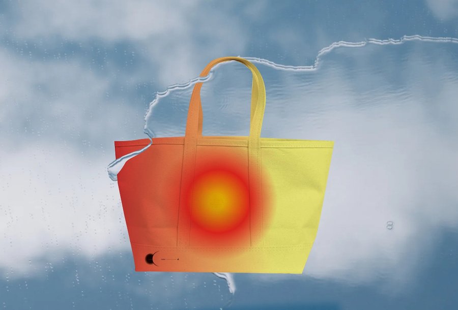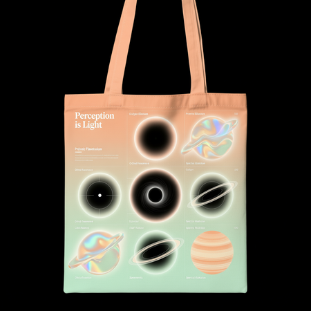 Create a tote bag in a classic for the Olafur Eliasson Prismatic Planetarium using text, gradients, and spherical shapes. The colors are subtle: light orange, light green, and dark gradient black holes.
