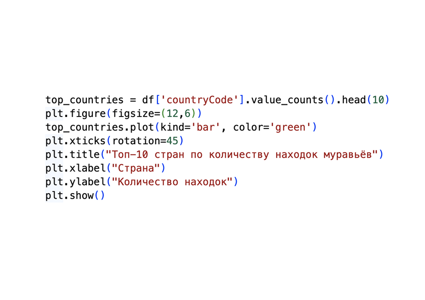 Мне показалось интересным проследить, какие страны чаще других фигурируют в наблюдениях за муравьями. Это помогает понять, где сосредоточены основные исследовательские усилия и насколько географически разнообразна база данных. По сути, такой график отражает не только ареалы видов, но и активность мировой научной сообщества, занимающегося изучением муравьёв.