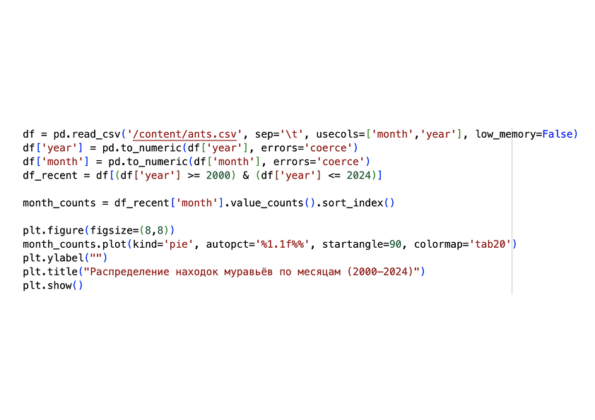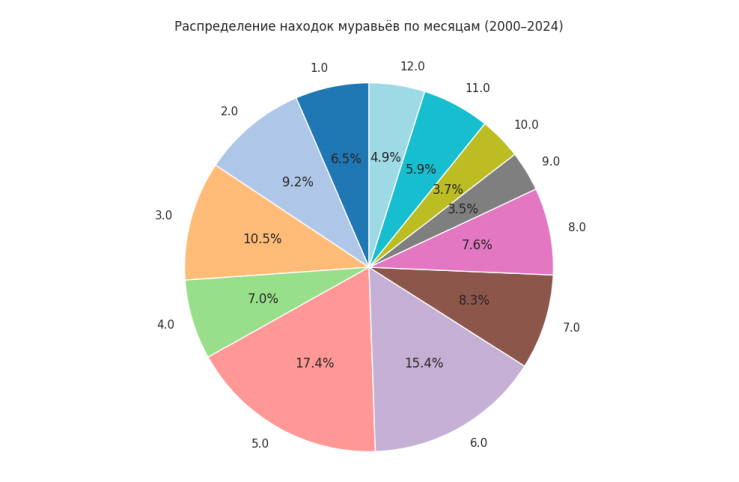 Чтобы выявить сезонные особенности активности исследователей, я проанализировал распределение находок по месяцам. Этот график показывает, в какие периоды года муравьёв находят чаще всего. Такие пики часто совпадают с сезонами экспедиций, временем цветения растений или периодами наибольшей активности самих муравьёв. Анализ помогает понять не только ритм научных наблюдений, но и природные циклы, влияющие на жизнь колоний.