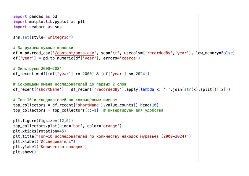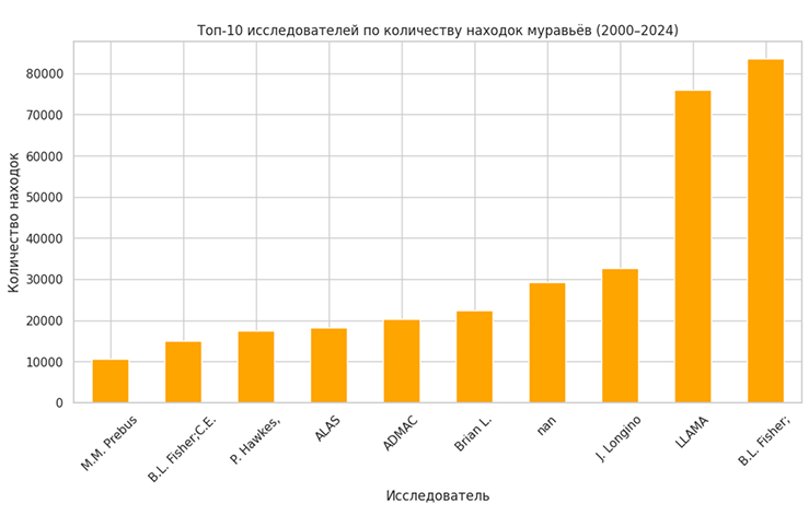 Чтобы определить, кто внёс наибольший вклад в исследование муравьёв, я выделил пятерых исследователей с наибольшим числом зарегистрированных находок. Такой анализ помогает понять, чьи работы сформировали основу современных данных о разнообразии видов и их распространении. Эти имена отражают не только индивидуальные достижения, но и географию научных школ, активно занимавшихся мирмекологией.
