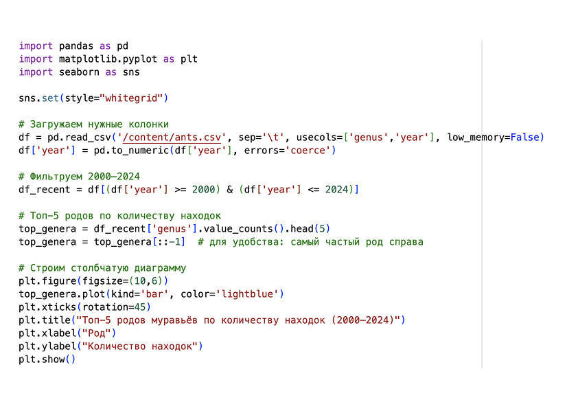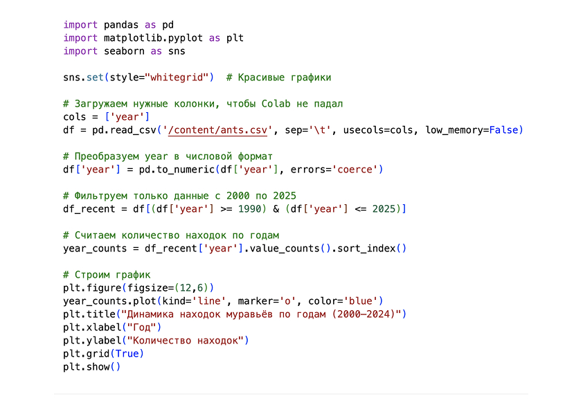 Чтобы понять, как развивалось исследование муравьёв с течением времени, я решил проанализировать динамику находок по годам. Такой график показывает, когда интерес к теме особенно возрастал, а когда, наоборот, наблюдался спад активности. Это позволяет увидеть связь между историческими этапами науки, развитием технологий сбора данных и увеличением числа публикаций в энтомологии.