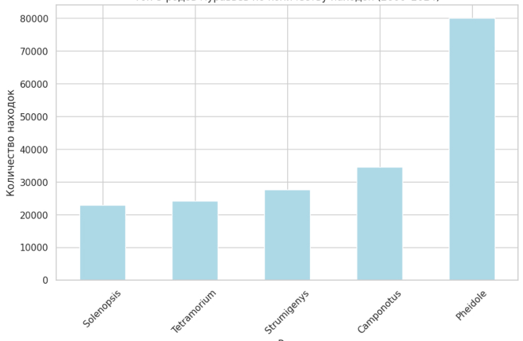 Этот график отражает, какие роды муравьёв исследователи находят чаще всего. Он помогает понять, какие группы наиболее распространены или, наоборот, лучше изучены благодаря доступности ареала. Высокие показатели у некоторых родов могут говорить не только о численности видов, но и о научном интересе к ним — например, если род известен необычным поведением или значимой ролью в экосистеме. Таким образом, топ-5 родов показывает, где сосредоточено внимание исследователей и какие направления требуют дальнейшего изучения.