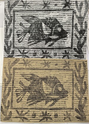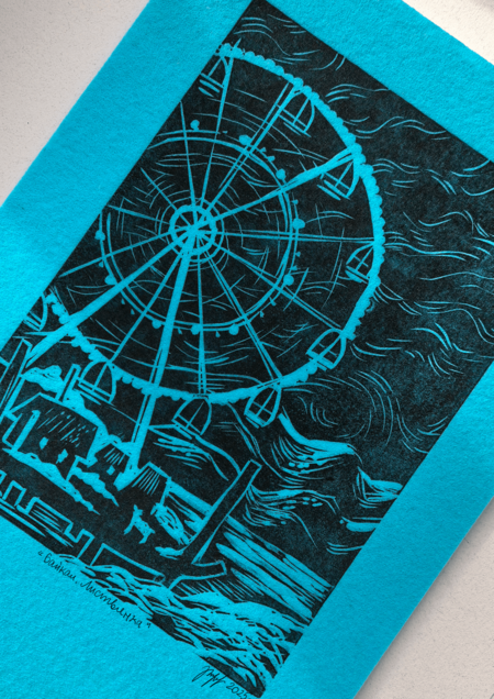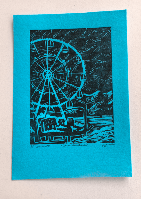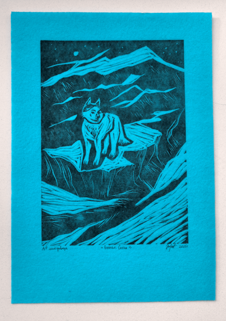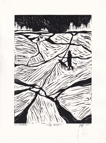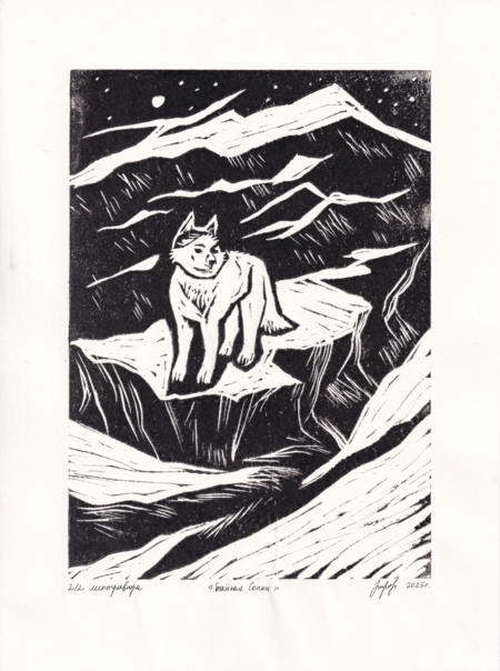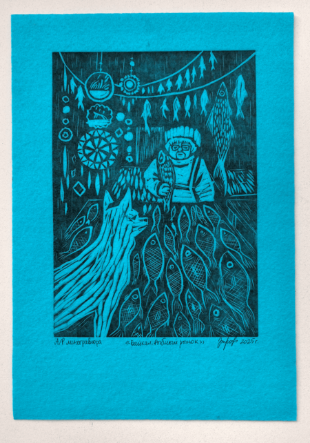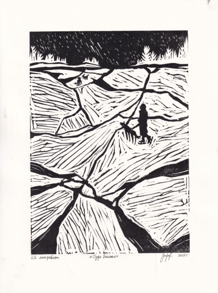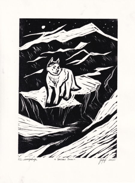 Серия из четырех линогравюр про путешествие хаски по Байкалу, которая исследует природные пейзажи и городские места. Используются характерные символы Байкала — лед, сопки, рыба, рынок, колесо обозрения в Листвянке, заснеженная природа, коньки.