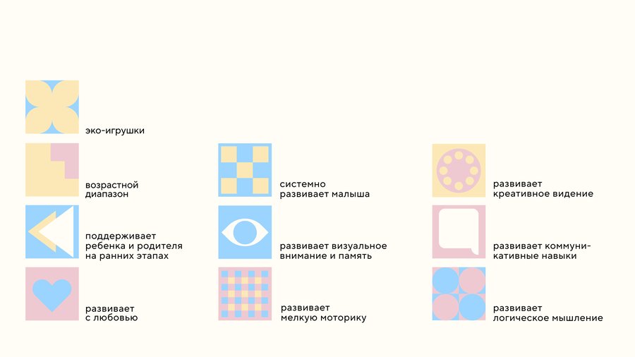 Айдентика, построена на иконках, отражающих основные ценности бренда и потенциал, который заложен в игрушки.