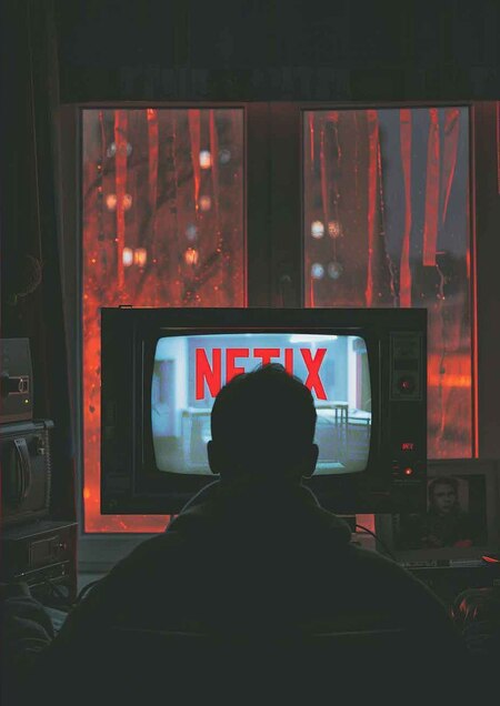 Для генерации обложки я использовала нейросеть Midjourney, промпт: make cover without any text for the project about netflix. Use red, white and black colors in netflix color palette. Make it look like an old monitor with something playing, use noise --ar 57:80.