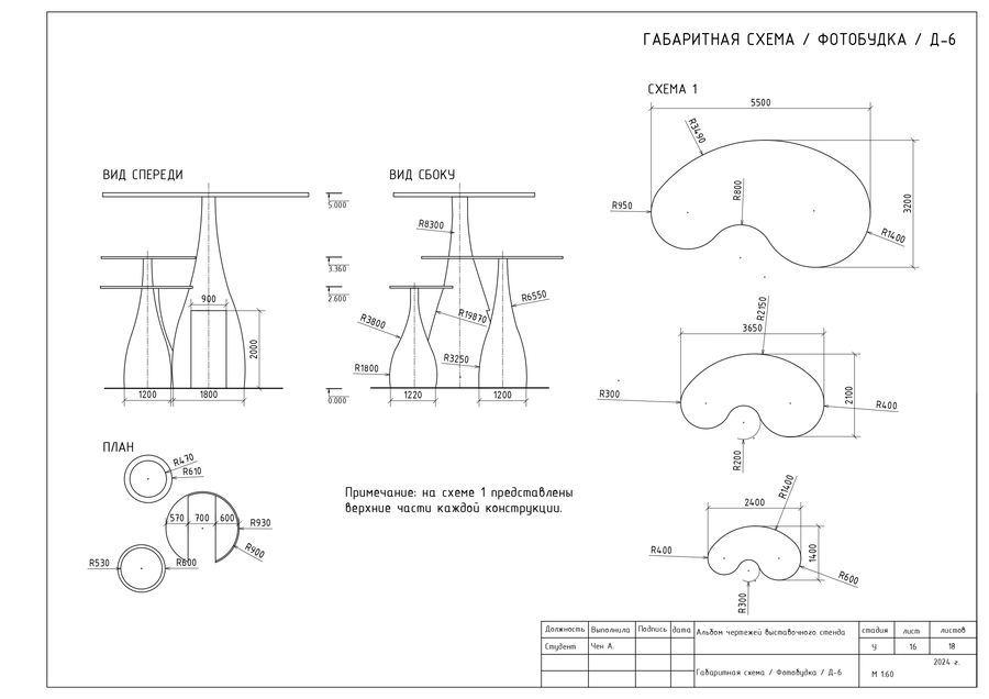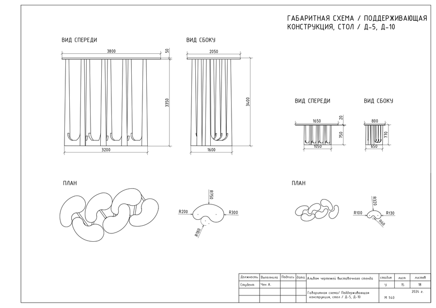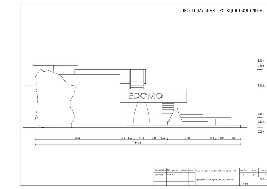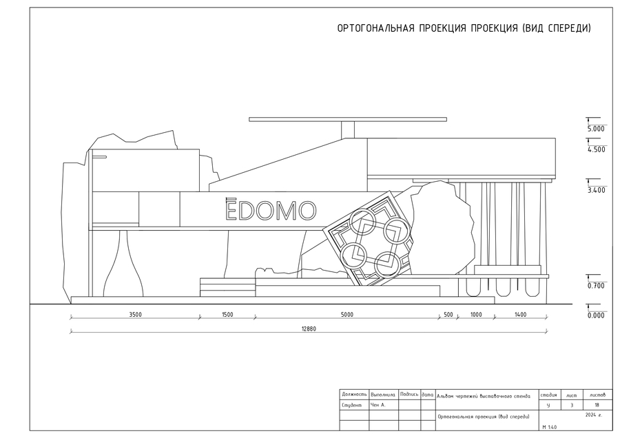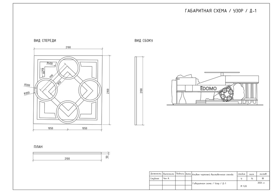 Проект представляет собой альбом чертежей выставочного стенда для бренда 'EDOMO'. В альбоме приведены ортогональные проекции, разрезы и габаритные схемы отдельных декоративных элементов стенда, а также планы расстановки и спецификация мебели.