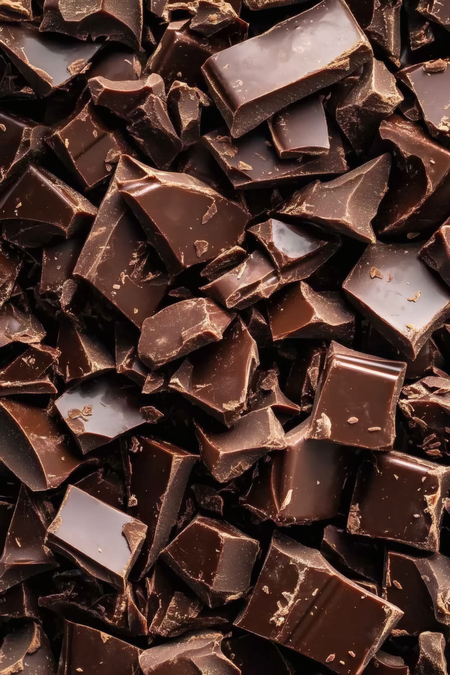 Промпты: A close-up of dark chocolate chunks, with some slightly melted and others still in their original state, scattered on top of the pile. Dark chocolate chips lying on plane background. Chocolate shavings slightly melted on top of the pile. Different color chocolate bars on top of each other with nuts on top of them.