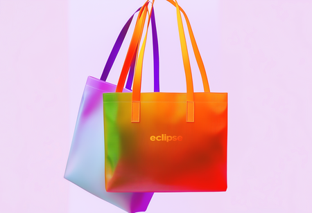 modern high-fashion shopper handbag with sleek, minimalistic design and simple text «eclipse» on it. Clean lines, blending elegance with contemporary trends. White minimalistic graphic elements vivid orange pure and bright color accents, retrofuturistic vibes, simple forms and shapes, fluorescent color scheme, a ghostly glow, and a holographic gradient effect --ar 16:9