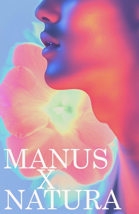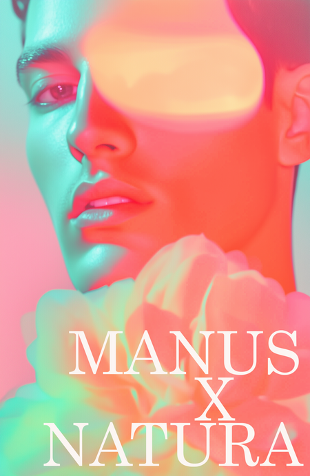 https://s.mj.run/4pxh0VAGIwY high fashion man and his reflection at cover of high fashion magazine with a gorgeous flower in the middle of composition with a fluorescent color scheme, a ghostly glow, and a holographic gradient effect, in a surrealistic style, in the style of Hsiao Ron Cheng. Big text «MANUS X NATURA» on it as it is a poster and logo «eclipse» --ar 21:4