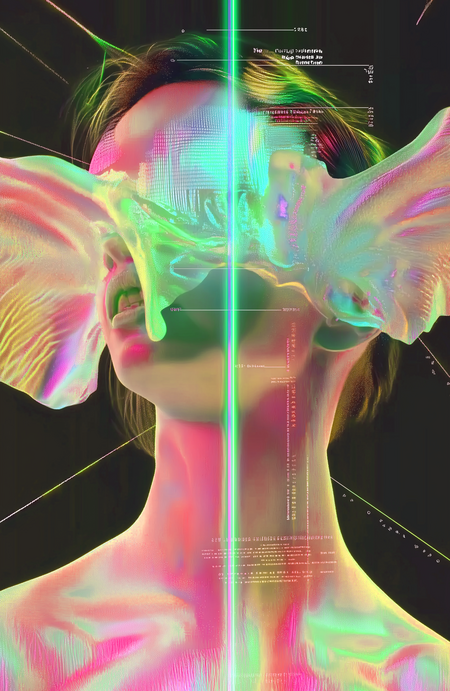 fluorescent color scheme, a ghostly glow, and a holographic gradient effect