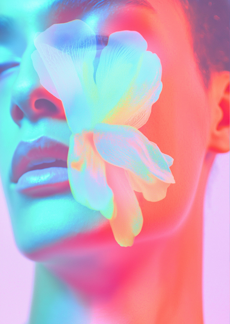 https://s.mj.run/4pxh0VAGIwY high fashion man and his reflection at cover of high fashion magazine with a gorgeous flower in the middle of composition with a fluorescent color scheme, a ghostly glow, and a holographic gradient effect, in a surrealistic style, in the style of Hsiao Ron Cheng