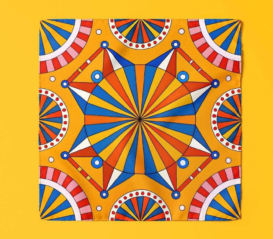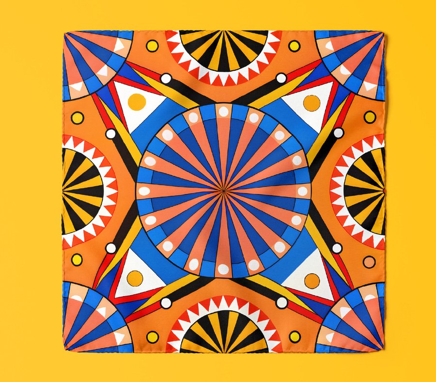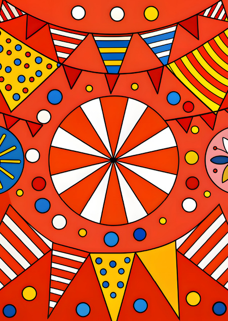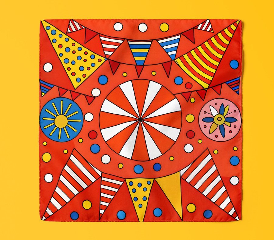 Промт: сделай симметричный узор для платка с полосками и цветными кружочками и цирковыми треугольными флажками Инструментарий: recraft.ai, Upscayl