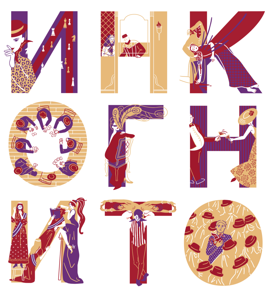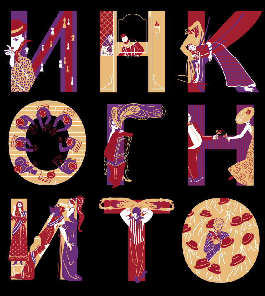 Буквицы в стиле нуара, из которых из которых можно составить слово «инкогнито» и не только.