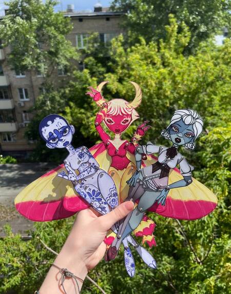 Я принимала участие в фестивале как художник и как автор мерча вместе с объединением «Клубок». В качестве мерча я представила авторские плакаты, стикерпаки, брелоки, открытки и коллекцию бумажных кукол.