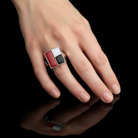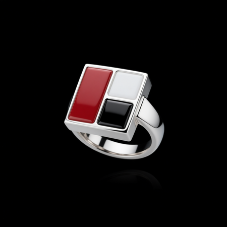 1. Кольцо: A high-resolution, studio product photograph of a modern, minimalist ring inspired by Tetris game pieces. The ring features three distinct, glossy enamel blocks (red, white, black), each encased in a polished, silver-toned metal frame. Background is pitch black.