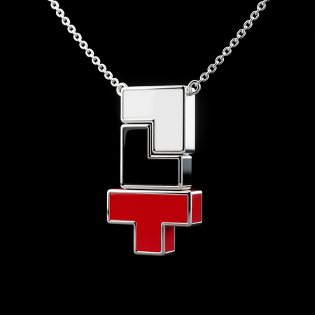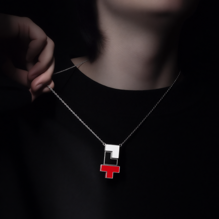 3. Колье: A high-resolution, studio product photograph of a modern, minimalist necklace pendant inspired by Tetris game pieces. The pendant features three distinct, glossy enamel blocks (red, white, black), each encased in a polished, silver-toned metal frame. The entire pendant hangs from a delicate, fine-link silver chain. Background is pitch black.