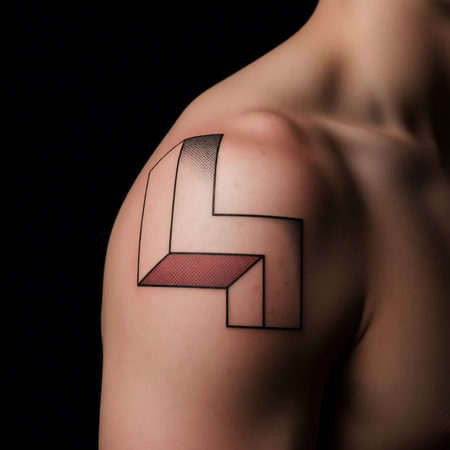 10. Татуировка: Photorealistic image of a pale male shoulder on a solid black background. Faithfully apply the provided logo onto the skin, replicating it precisely without any alterations or stylization. The skin should have realistic texture with small blemishes, scars of various shapes and ages, and moles. Crucial: the logo itself must remain completely unchanged.