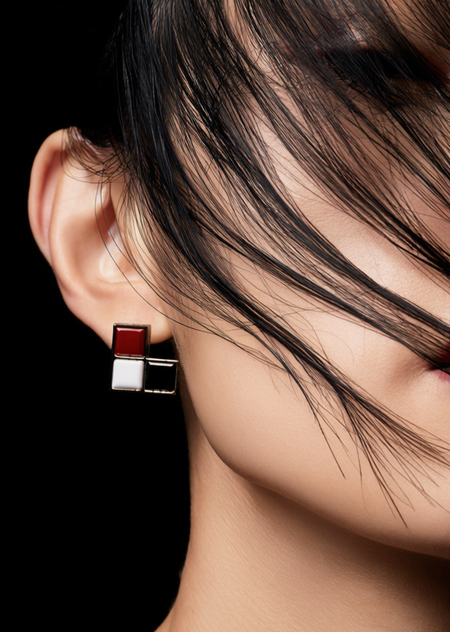 5. Серьга: A high-resolution, studio product photograph of a modern, minimalist earring inspired by Tetris game pieces. The earring features three distinct, glossy enamel blocks (red, white, black), each encased in a polished, silver-toned metal frame. Background is pitch black.
