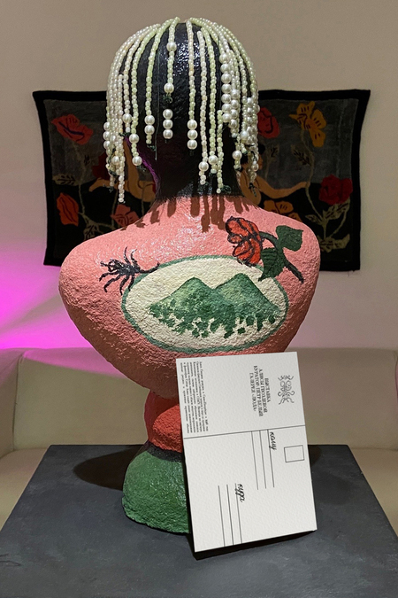В айдентике выставки используются зелёный и розовый цвета, передающие общее впечатление от палитры работ Алисы Гвоздевой