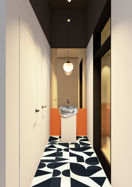 Современный яркий интерьер с элементами стиля мидсенчури. Для активных и дерзких, ценителей вкуса настоящей пиццы из помпейской печи.