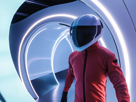Ideogram: Design an indoor skydiving tube for POTOK that blends functionality with a sleek, modern aesthetic. The tube should have a transparent cylindrical structure made of high-quality, durable glass, providing a clear view of the interior while emphasizing safety. The glass walls should be framed with smooth, matte silver or brushed metal, ensuring a futuristic and polished appearance.