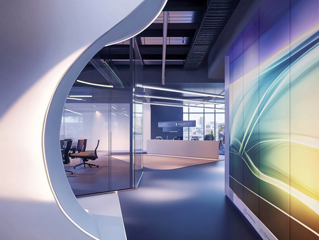 The exterior should feature subtle, flowing line patterns inspired by air currents, integrated into the design using soft LED lighting for a glowing effect. Use a clean color palette of sky blue (#5BC0EB), pure white (#FFFFFF), and accents of mint green (#A2E4B8) to evoke lightness, energy, and movement.