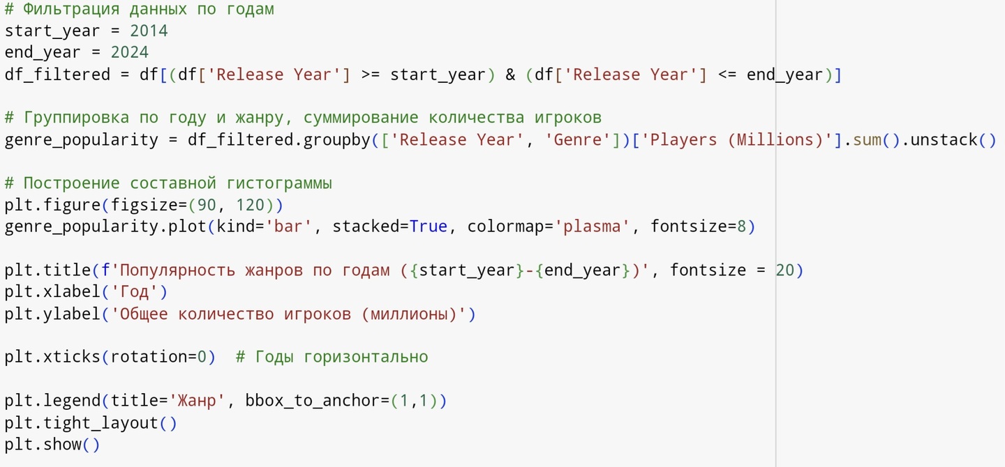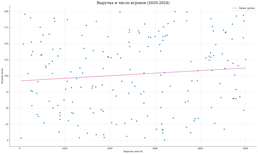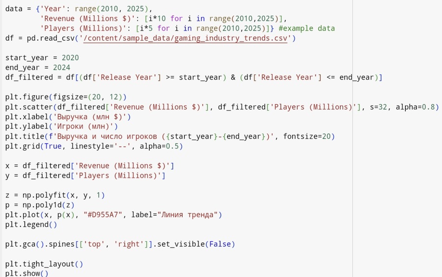 Анализ построен на базе данных Gaming Industry Trends с сайта Kaggle.com. Большая часть внимания уделялась на выборку игр, выпущенных в 2020–2024 годах. Из всей таблицы нужная нам информация — это год релиза («Realising Year»), компания-разработчик («Developer»), сумма выручки («Revenue (Million $)»), число игроков («Players (Millions)»), на какой платформе выпустилась игра («Platform»). Всё это необходимо для того, чтобы мы смогли выделить вероятные черты будущей самой успешной иглы 25 года.