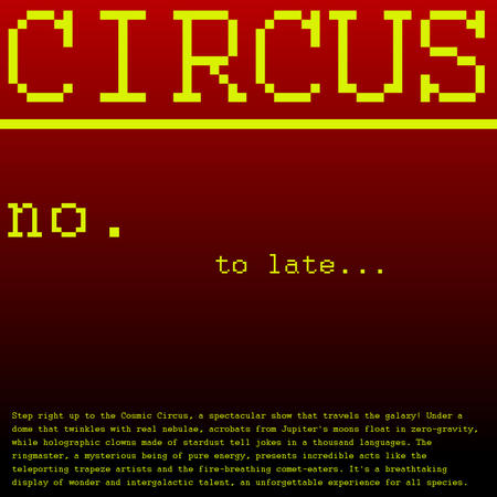Серия анимированных роликов посвящённых образу космического цирка, который скрывает под своей яркостью и весельем распространение инопланетного вируса.
