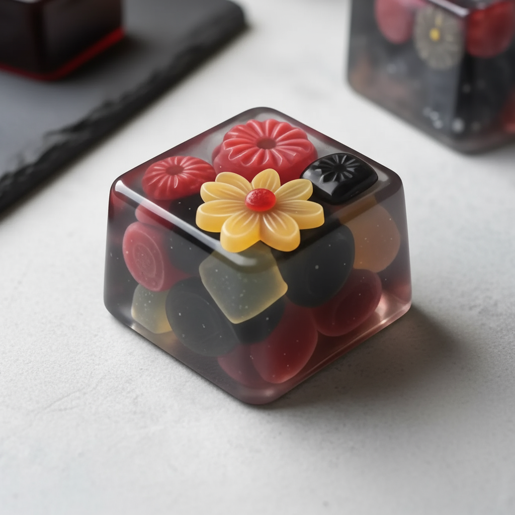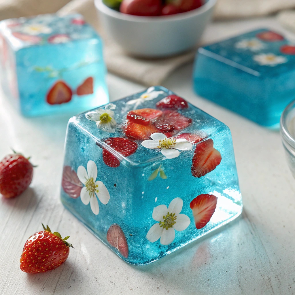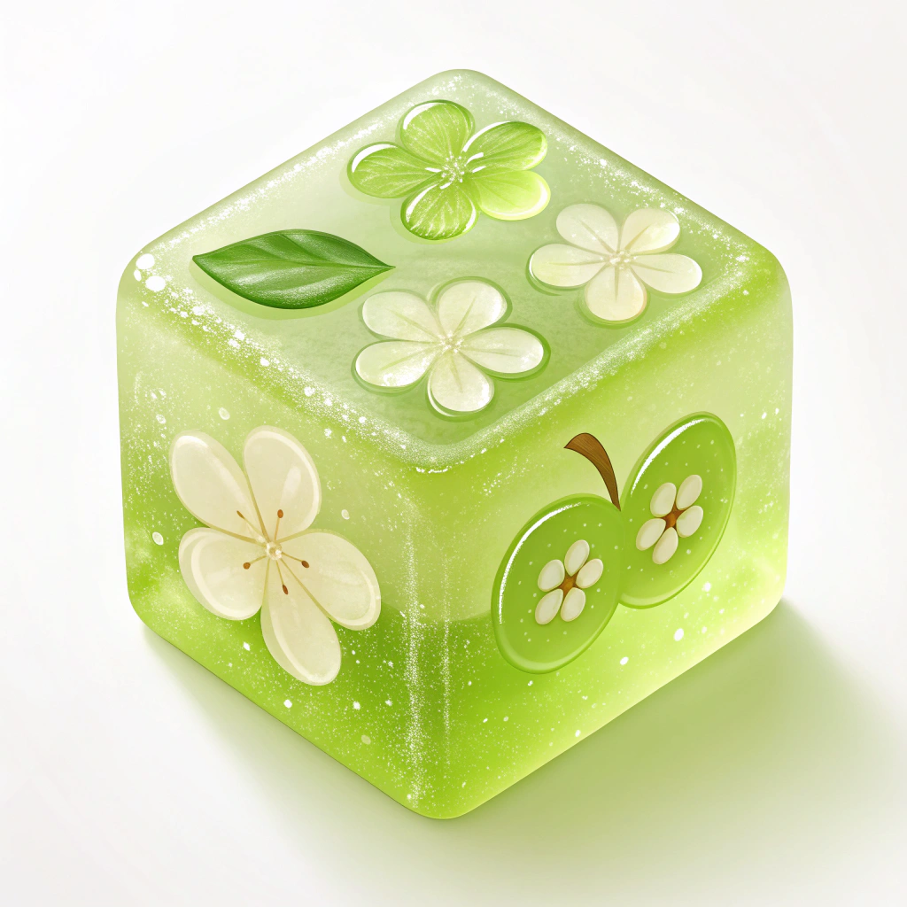 Нейросеть: Recraft.ai Промт: Isometric cube-shaped gummy candy, translucent and glossy, flavored with [вкус], colored in vibrant [цвет], with pieces of flowers embedded inside the cube, detailed texture showing soft jelly and shimmering surface, soft lighting highlighting the candy’s translucency, background softly blurred to emphasize the cube, photorealistic style, clean and sharp edges, cute and appetizing appearance.