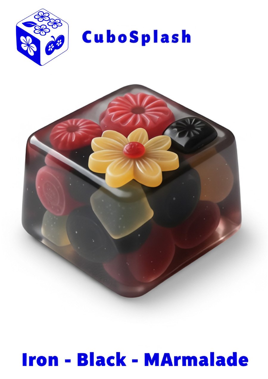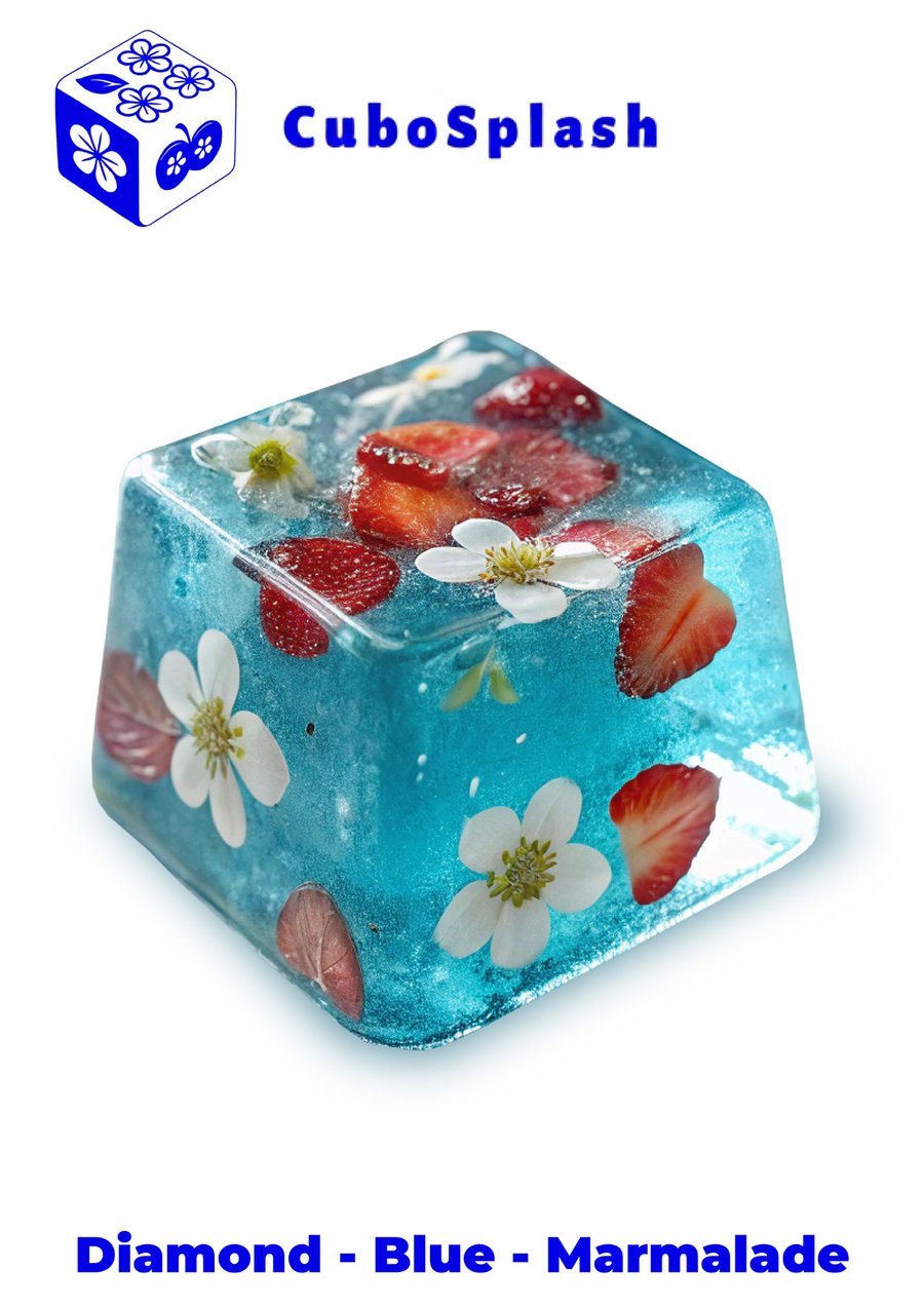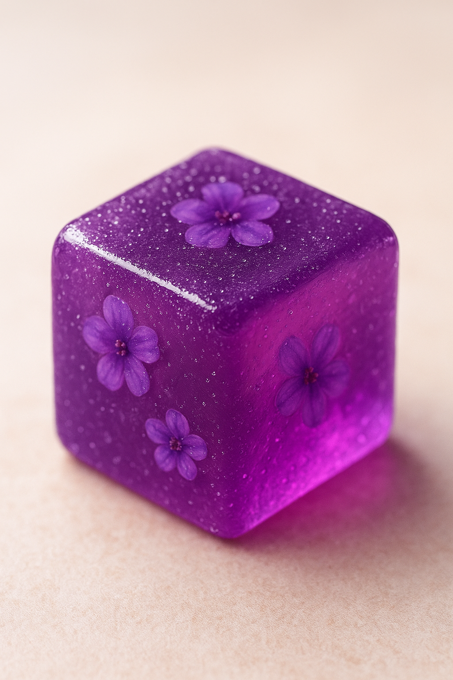 Нейросеть: Recraft.ai Промт: Isometric cube-shaped gummy candy, translucent and glossy, flavored with [вкус], colored in vibrant [цвет], with pieces of flowers embedded inside the cube, detailed texture showing soft jelly and shimmering surface, soft lighting highlighting the candy’s translucency, background softly blurred to emphasize the cube, photorealistic style, clean and sharp edges, cute and appetizing appearance.