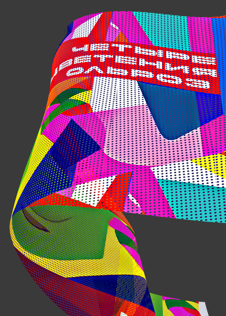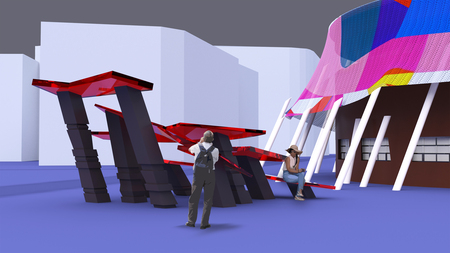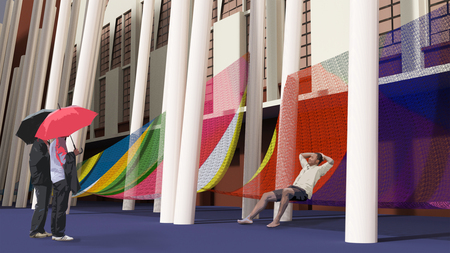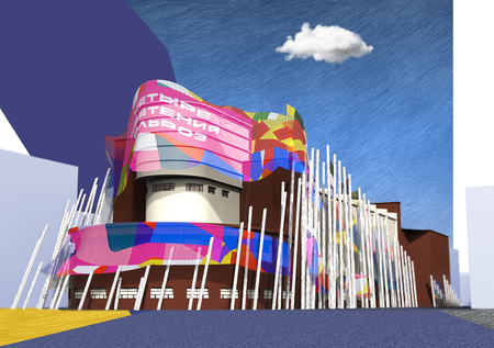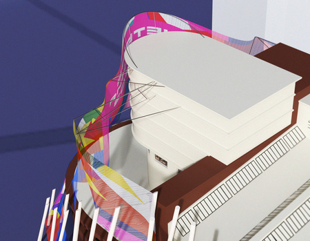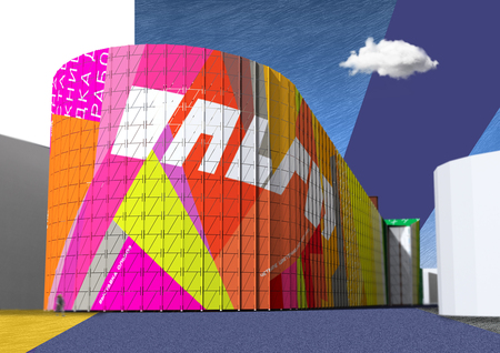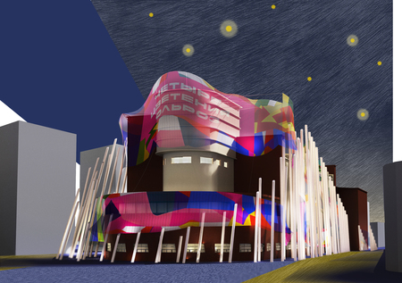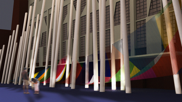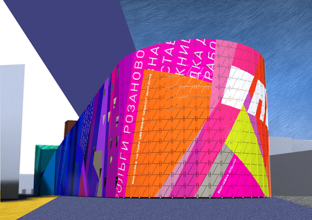 Проект вдохновлен экспериментами Ольги Розановой с цветом, формой и пространством. Фасад имитирует её метод сопряжения графики и цвета, но в динамике: пластины, двигаясь, раскрывают новые визуальные сочетания, словно оживляя её художественные принципы. Конструкция представляет собой механические кинетические теларии, закрепленные на столбах. В закрытом виде — плоское изображение лицевого фасада, где расположена основная информация о выставке. В раскрытом — взаимодействие цвета и пространства.