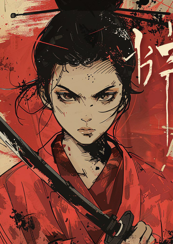 Create a concept of a main character for a 2D sidescroller game. The game is about female samurai in ancient Japan. She has to wear a traditional japanese kimono of red color. The kimono is long enough to hide her legs. Her hair has to be black. The image of her has to be similar to a traditional japanese art Sumi-E. She has to hold the traditional japanese sword. She hides it in her hair. She also wears an orange big sash.
