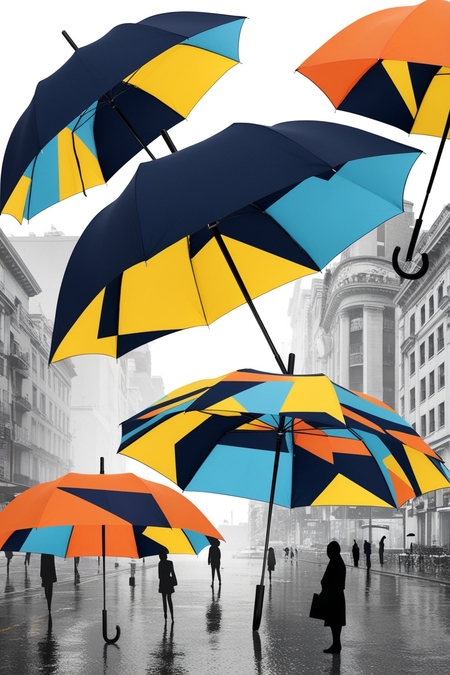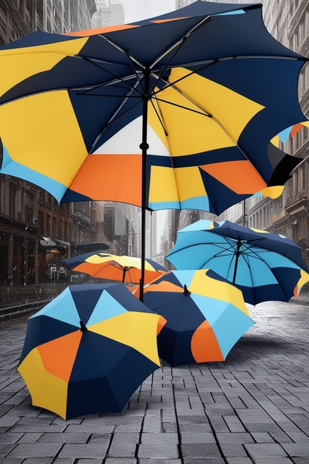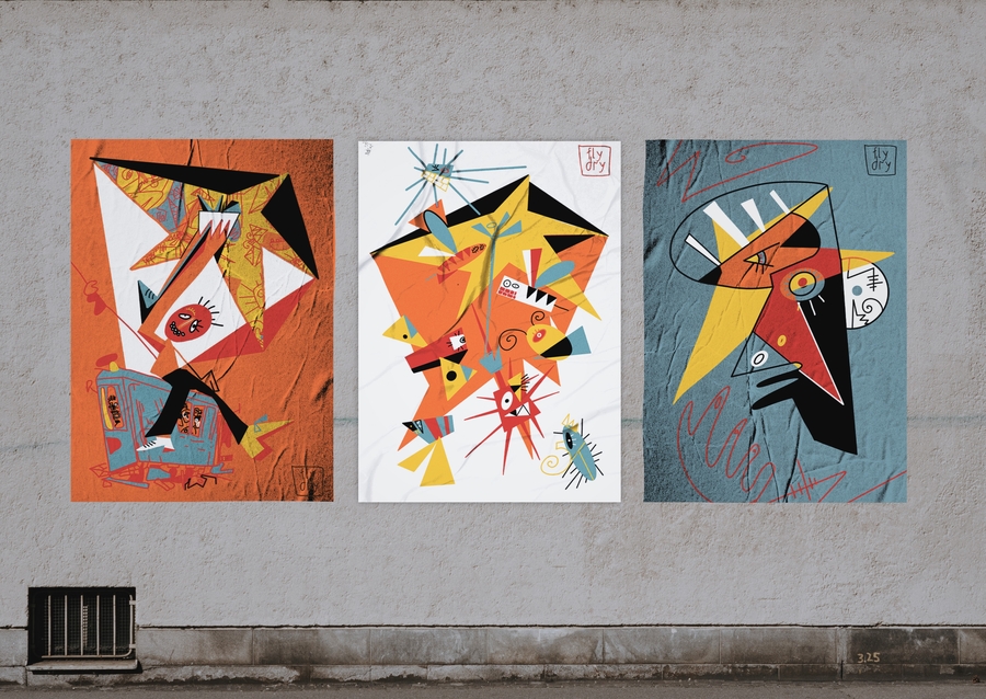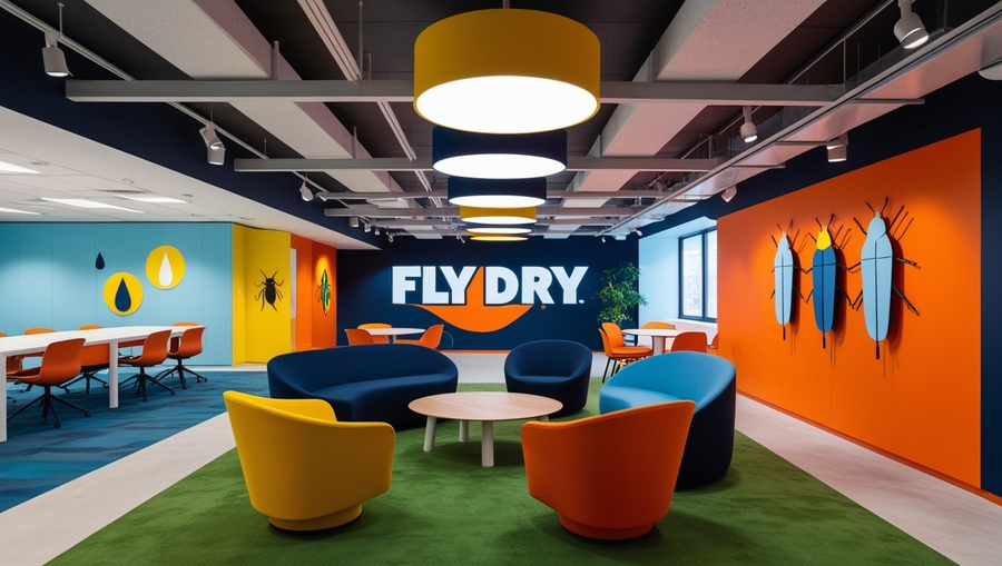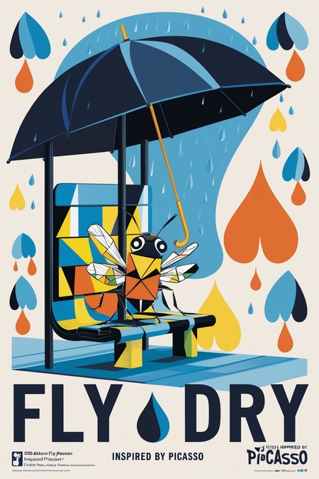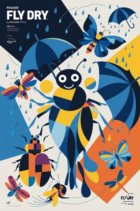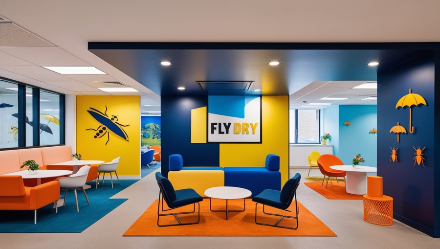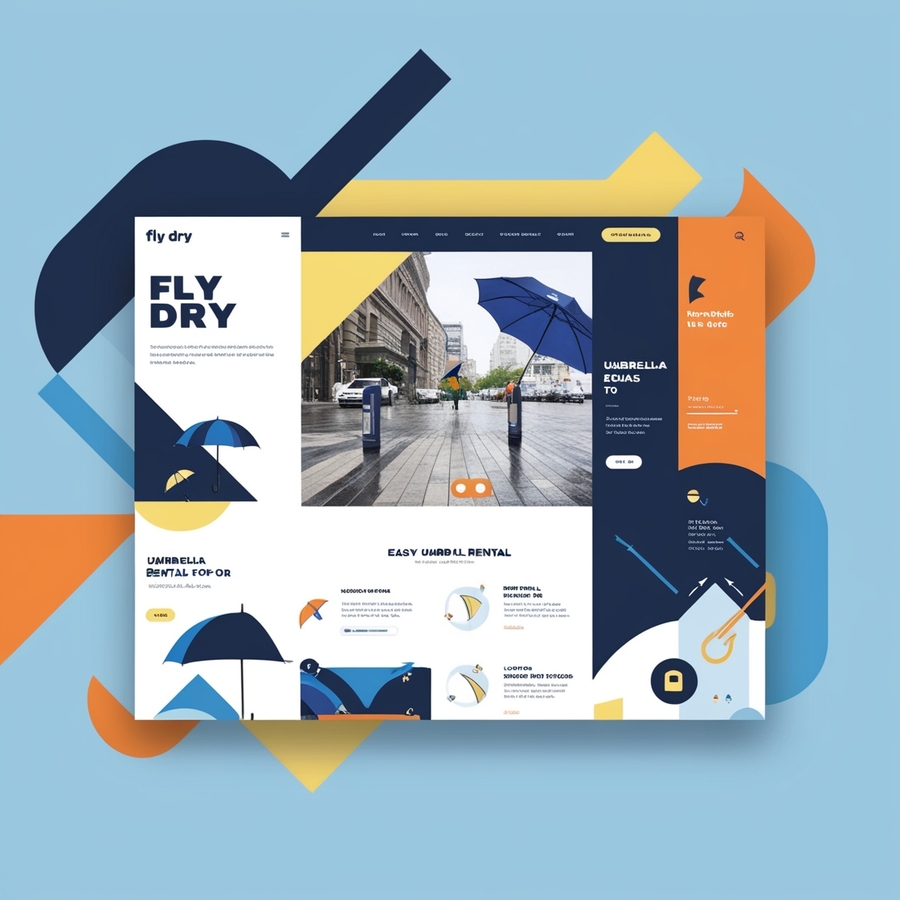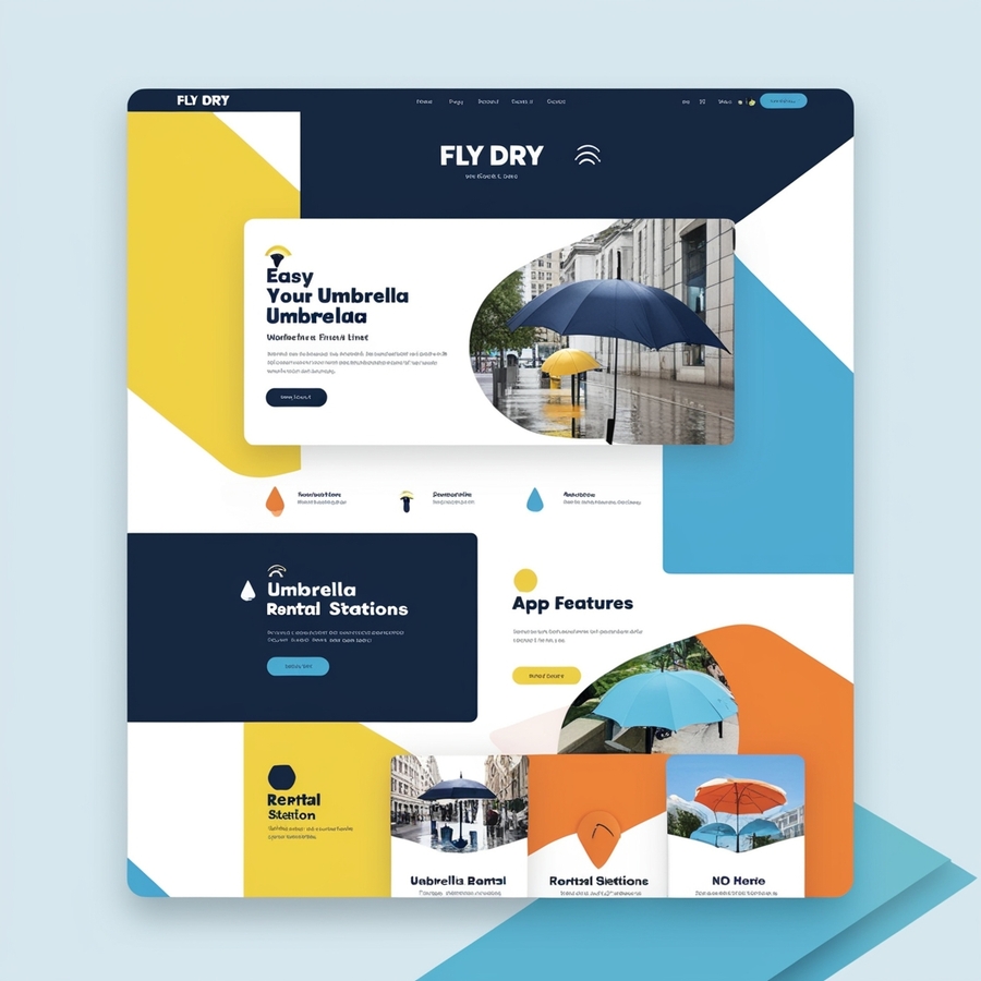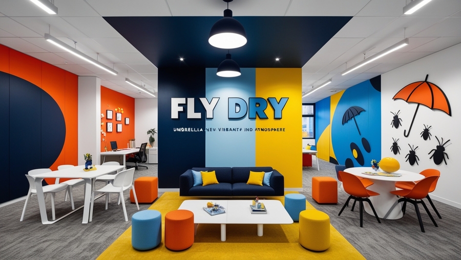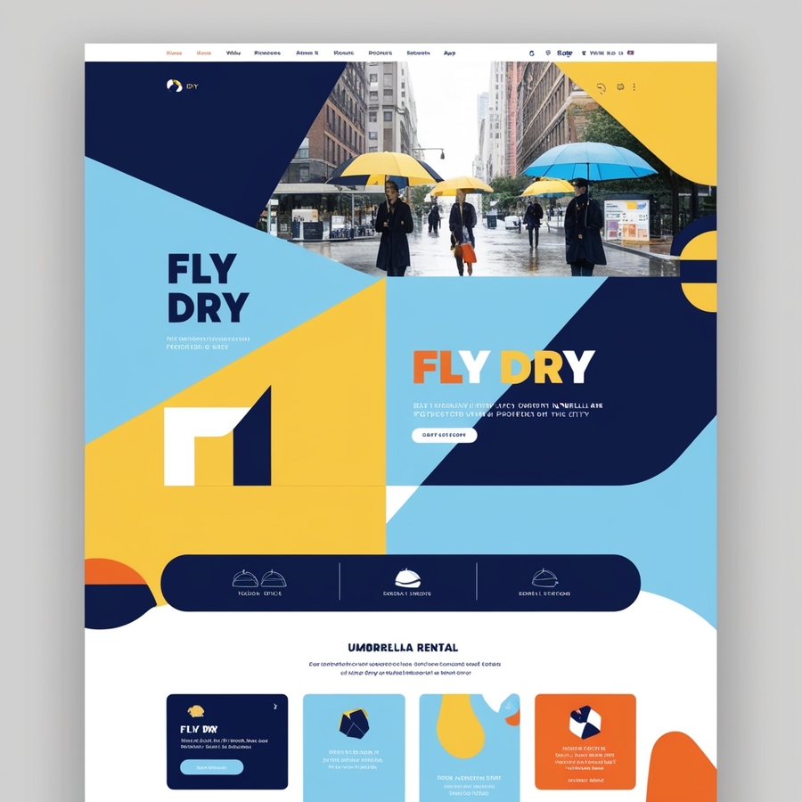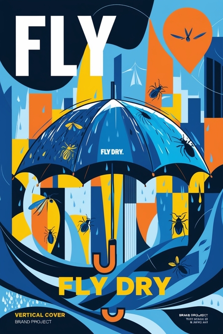 A modern and minimalist logo for Fly Dry — an umbrella rental service. The design should be bright, cheerful, and memorable, using vibrant colors such as yellow, blue, and orange. The logo should combine a stylized abstract image of a fly (the brand’s mascot) with elements of an umbrella or rain protection. The fly’s shape should be geometric and dynamic, symbolizing lightness, movement, and comfort. The logo must convey a sense of accessibility and care, highlighting the brand’s core value: providing comfort in any weather