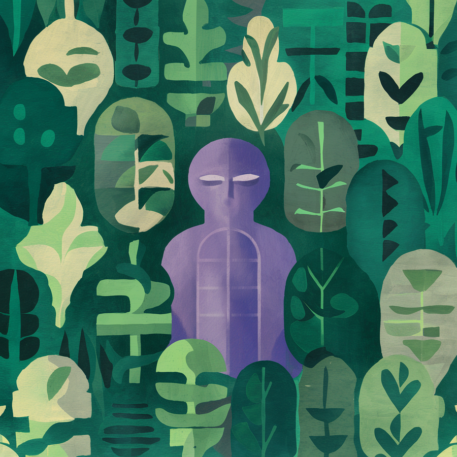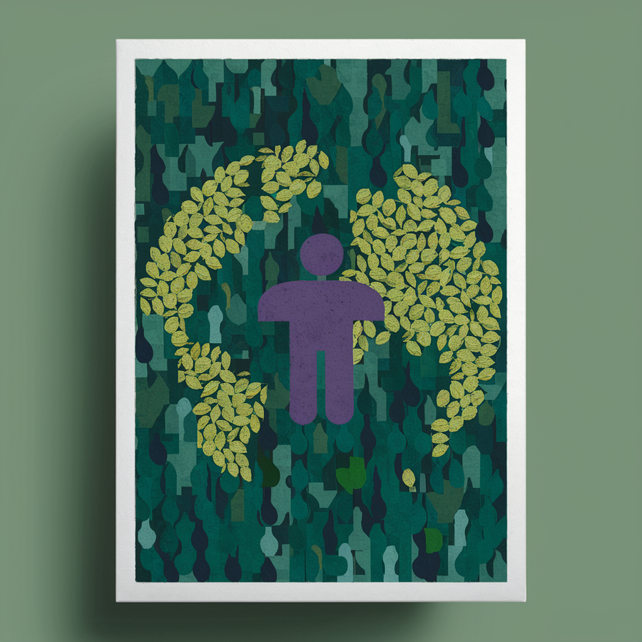 Сама идея заключается в использовании символики леса, в моем случае формы листьев, соединении ее с чем-то мистическим, можно использовать референсы кругов, людей и обрядов, и визуализации главной мысли — одиночества, отделение одного от других, в данном случае, цветом.