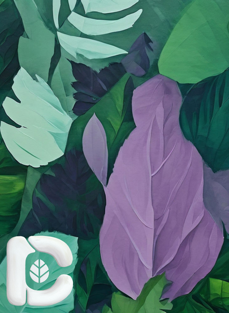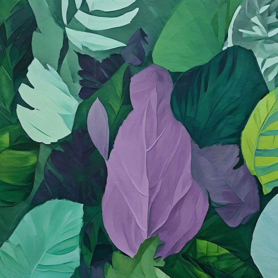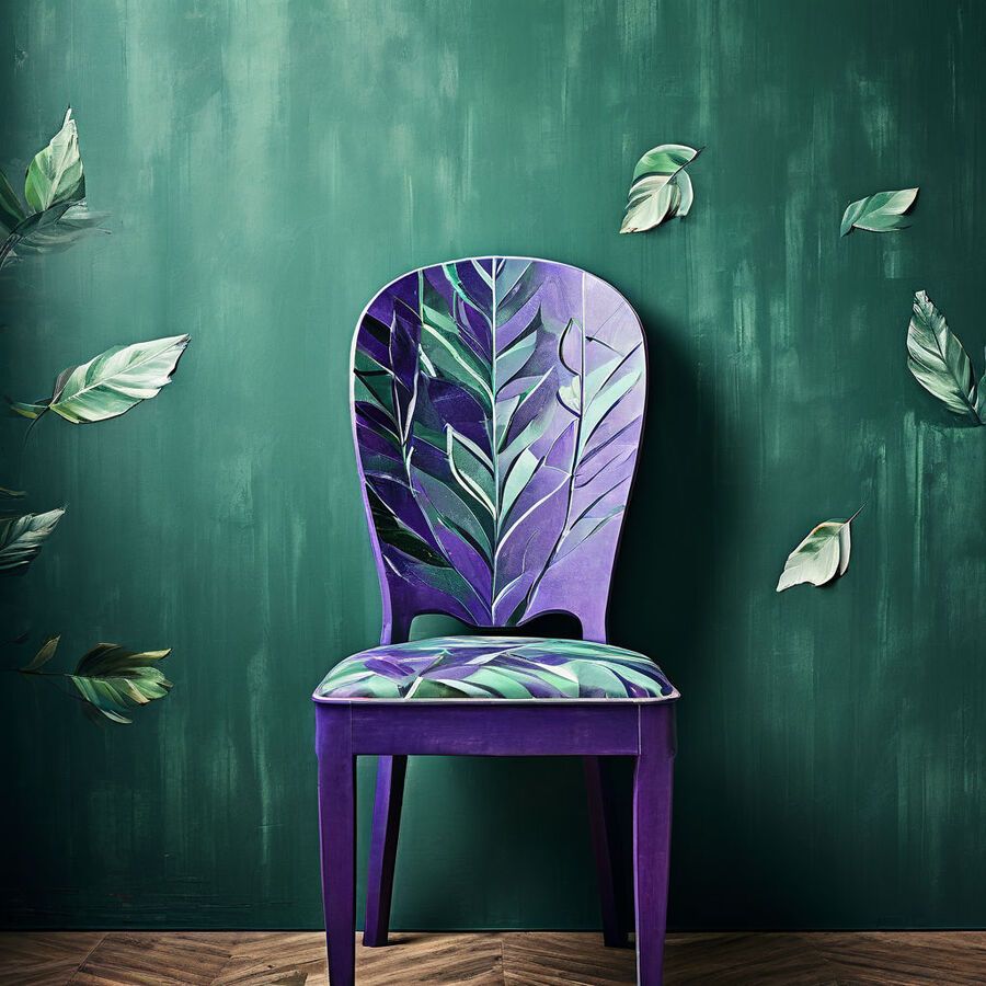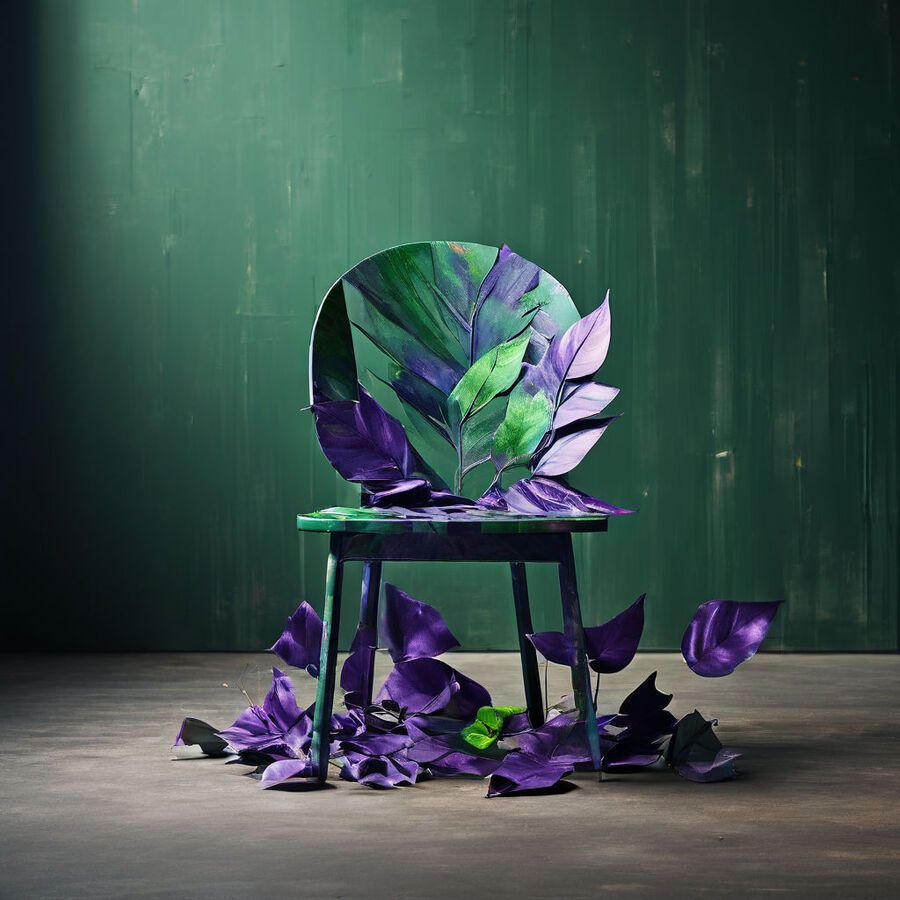 Playground.com: Minimalism, a chair painted with leaves in the impasto technique in green and purple tones, stands in the middle of an empty room, mystical