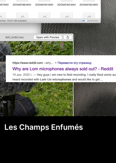Электроакустическая композиция, создание которой сопровождалось размышлениями о природе поля в контексте звукозаписи и о процессах, происходящих с зарегистрированным техникой звучащим. Материал собран при помощи рекордеров Zoom H1n и Tascam DR-40, а также контактных микрофонов и электромагнитных датчиков.
