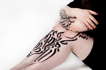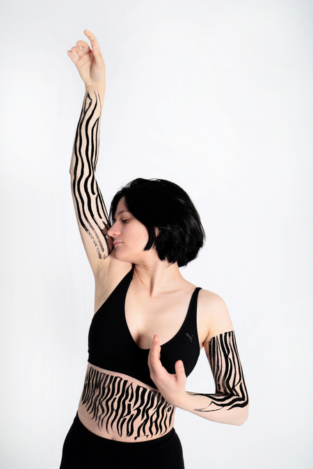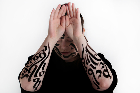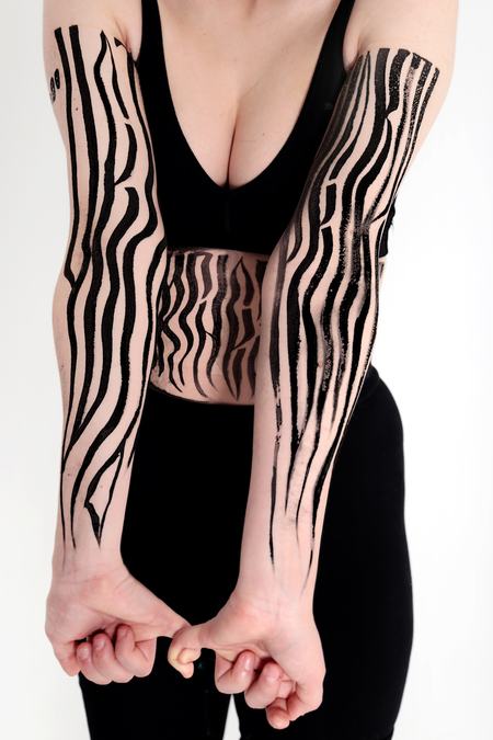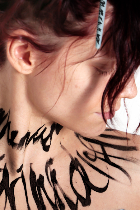 В рамках темы «Бестиарий» я создала боди-арт серию, отражающую внутреннее состояние персонажей. В основе каждой композиции лежат авторские вариации каллиграфических подчерков, соответствующих образам магических существ: — гарпия — готика; — дриада — полуунциал; — русалка — вязь; — оборотни — экспрессивное письмо.