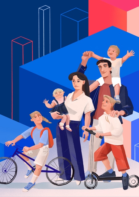 Центральный элемент иллюстрации — многодетная семья. Каждый персонаж обладает собственной индивидуальностью, но взгляды, которые они обращают друг на друга, связывают их в единое целое. Герои изображения формируют группу, устремлённую вверх. Так создаётся ассоциация с восходящим трендом, отображающим стремление к росту и развитию семейных ценностей.