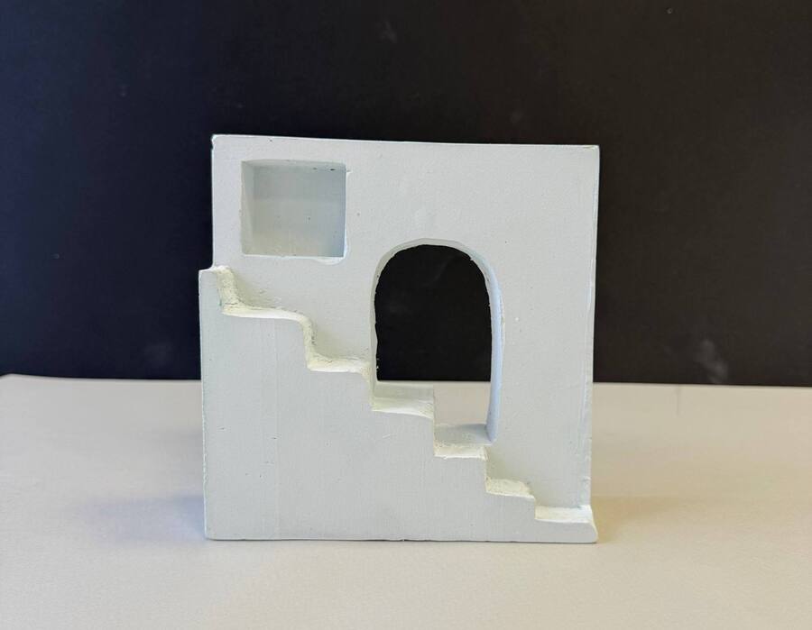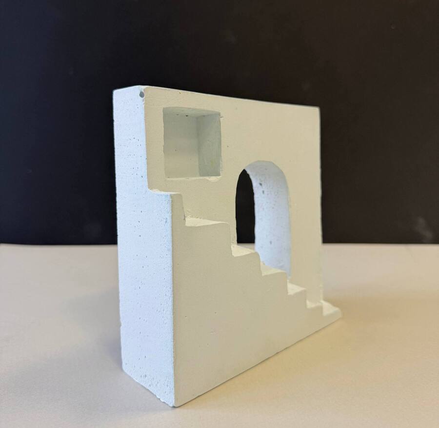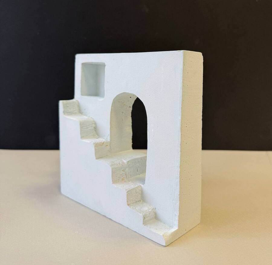 Архитектурный элемент состоит из трех основных частей: сквозная арка, углубленное окно и лестница на первом плане.