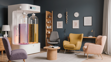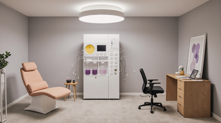 Промт: A wide horizontal photograph of a disciplined, professional doctor’s consultation room in the «Center for Donating Joy». This is a serious medical environment — clean, functional, and precise — where emotional care is delivered with clinical authority. Dominating the left side of the room: a wide, low-profile medical apparatus (2.4 m wide × 1.7 m tall), housed in a seamless casing of matte white medical ceramic with warm oak base panels. Its form is broad and grounded — not tall, but expansive — like a diagnostic console. On its front face: Two large borosilicate reservoirs: • Left: lavender-tinted bio-gel (for emotional load) • Right: vibrant sun-yellow transfusion medium (#FFD966 — warm, saturated, but not neon; like golden hour light) A monochrome e-ink display showing flow metrics and patient ID. A bank of six tactile ceramic buttons in a vertical row: white, peach, and two in sun-yellow (#FFD966). From the front and sides of the unit, eight flexible medical conduits extend outward — thick, braided-silicone tubes in sun-yellow (