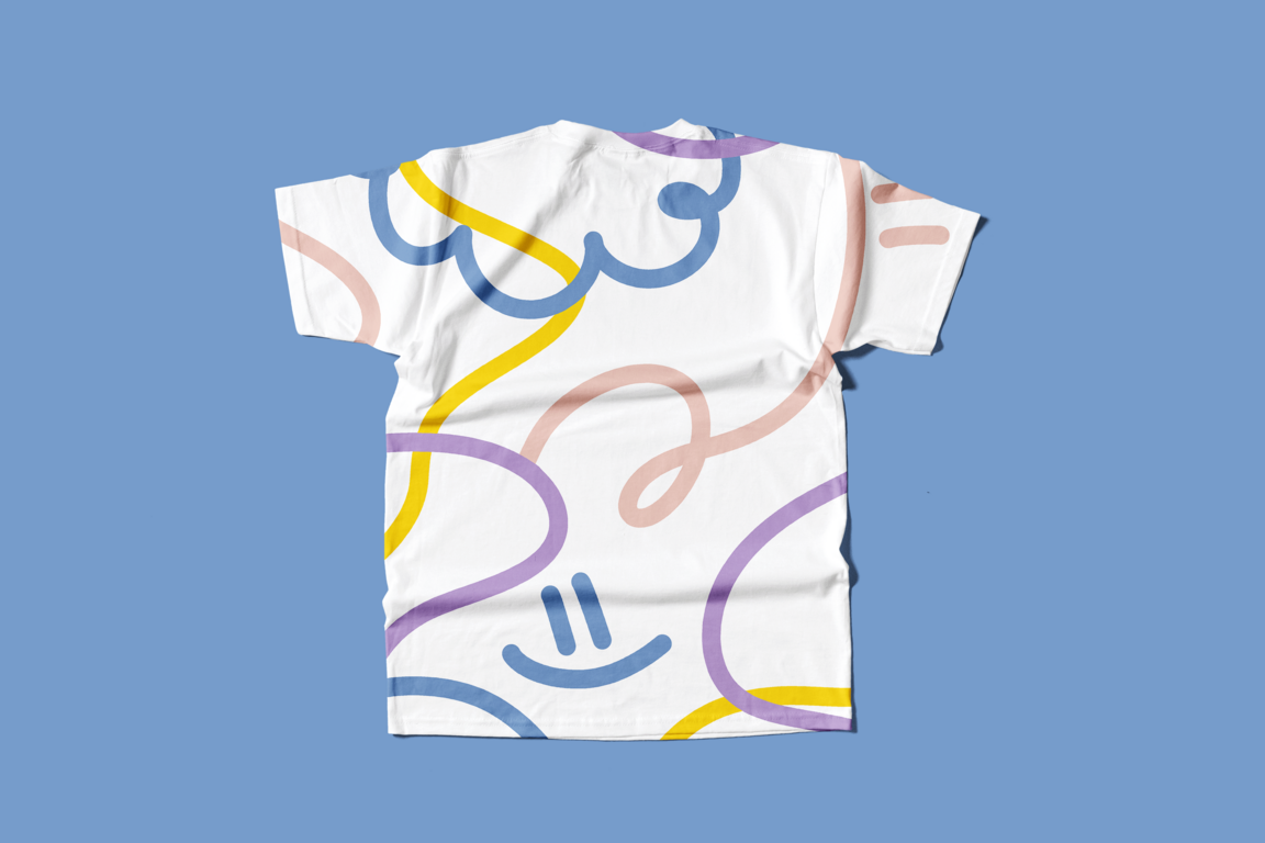 A wide horizontal ultra-high-resolution photograph of a white cotton t-shirt with a detailed minimalist graphic print centered on the chest, featuring elegant thin-line abstract smiley faces in sun-yellow (